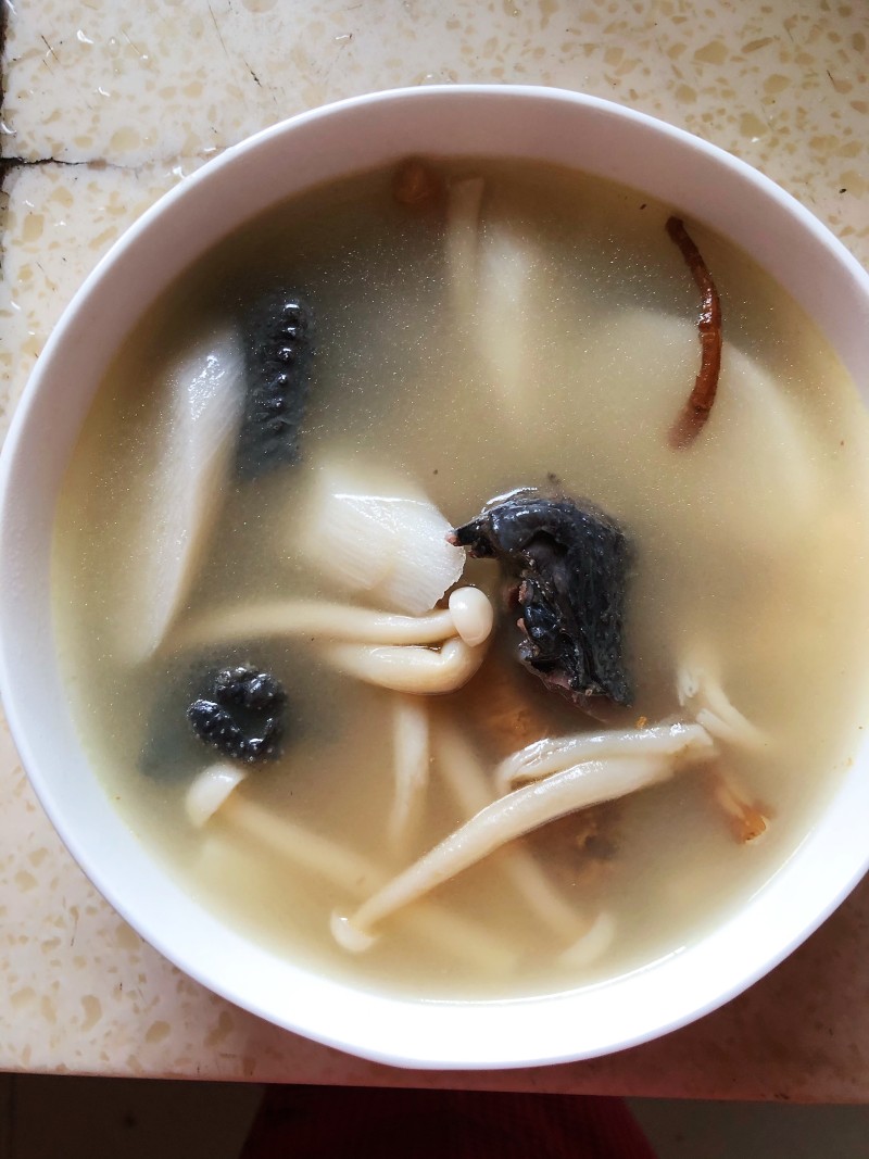 4:在熟前15分钟放入山药和海鲜菇即可。