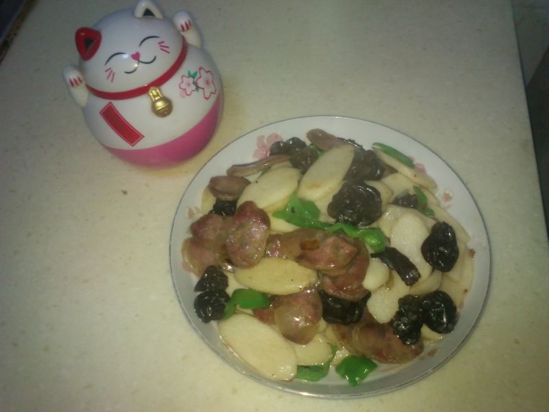 3:将腊肠片拨到锅的一边,下葱丝爆香。再依次下淮山药和木耳,加盐、鲍鱼汁翻炒均匀,最后下青椒片翻炒片刻即可。