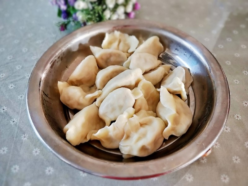 7:锅中放入适量清水,一小勺盐,烧开后倒入水饺,水开后加入一小碗凉水,煮三开,饺子发轻飘浮在水面,下压也不沉,就熟了。,