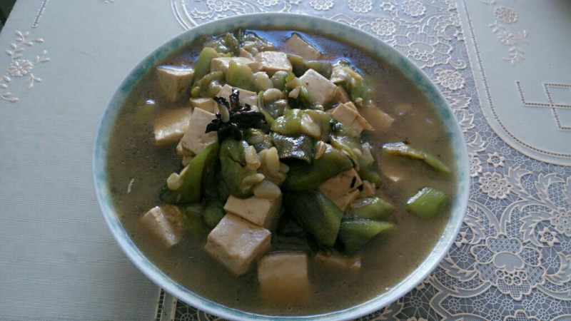 4:炝葱,下丝瓜略炒,加料酒,蚝油,生抽,白糖后,加开水,下豆腐。大火烧开改,小火炖入味。