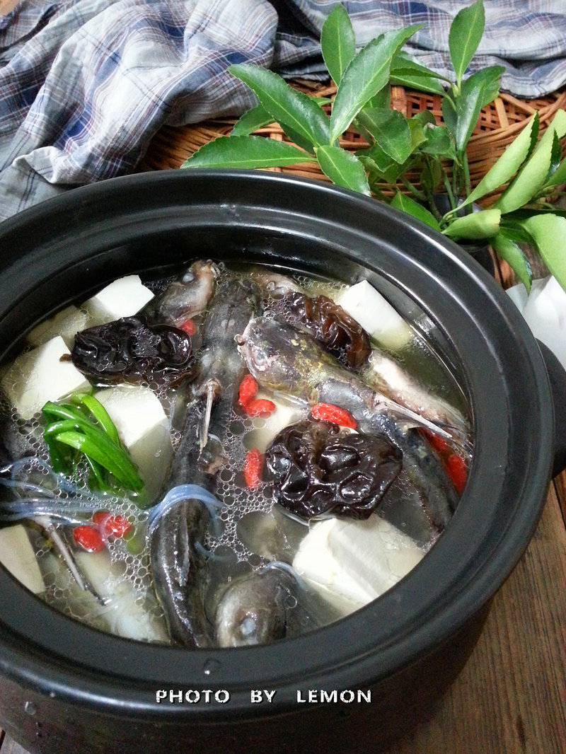 黄颡鱼6条;黑木耳8朵;枸杞20粒;生姜1个;粉丝1把;盐1勺;鸡精1勺;