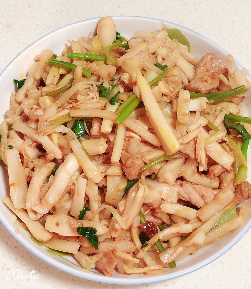 4:大火下油,下盐净炒干笋丝,熟悉后捞出备用,继续大火炒香肉丝后两种食材混合搅拌,出锅前撒入香菜即可。