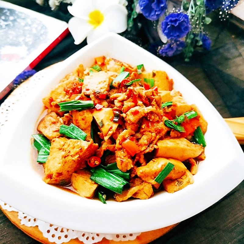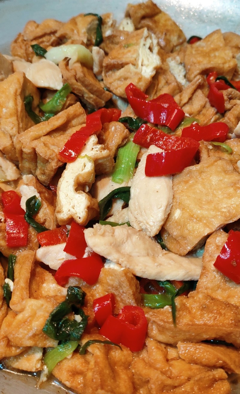 油豆腐500g;鸡胸肉400g;红泡椒3条;青葱3条;