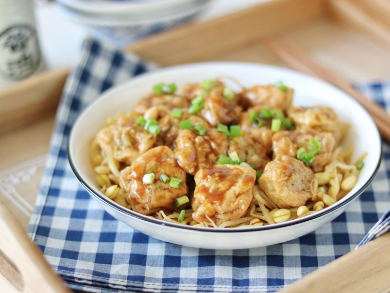 7:汤汁收到差不多,肉馅熟透关火。用豆芽铺满盘底,上面放上油豆腐。