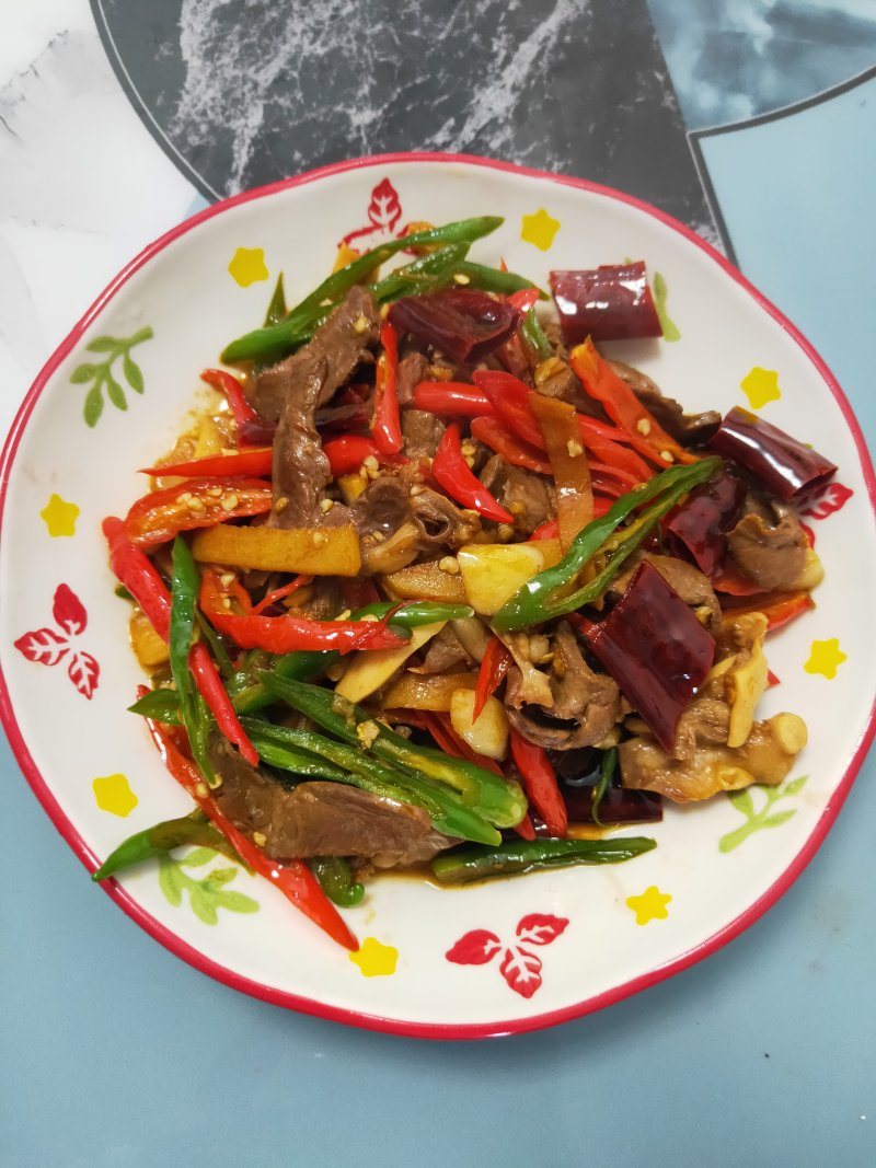 5:放辣椒继续大火翻炒,加少许盐和鸡精调味即可