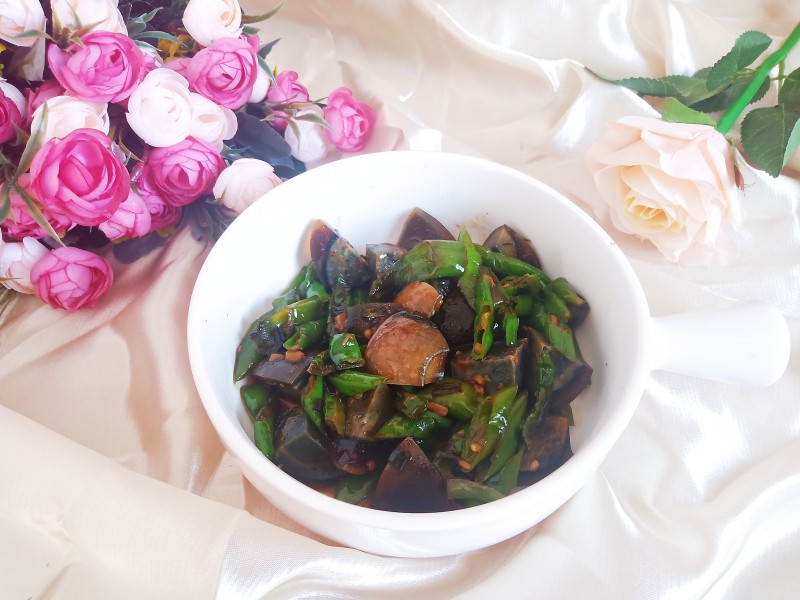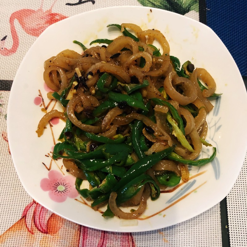 4:加入青椒翻炒,放一勺豆豉,一勺酱油即可。