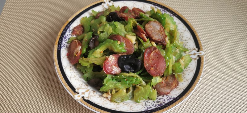 4:放入腊肠炒至苦瓜断生即可(不喜欢吃太苦的,可多炒一会,让苦瓜软一点)。