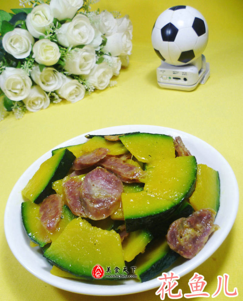 1:材料:日本南瓜、腊肠(已蒸熟)