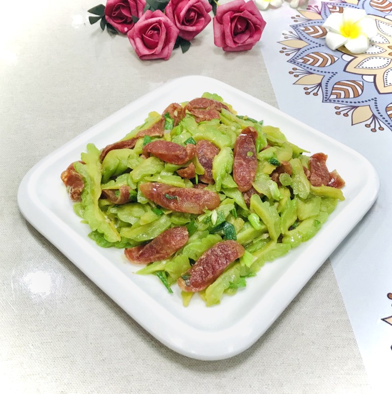 6:锅烧热放少许油,倒入姜和蒜爆香,再倒入苦瓜加盐调味,翻炒几下,继续倒入腊肠,翻炒一下即可。