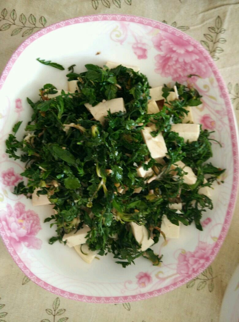 6:随后,合入豆腐和切好的荠菜翻动一下。