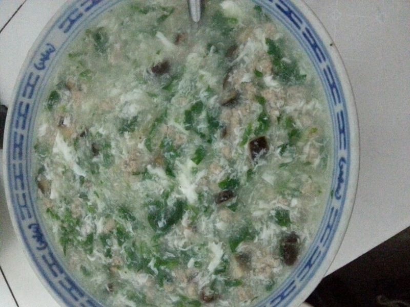 5:水烧开后一会,加入香菇末,荠菜末,再加适量盐,白胡椒调味。