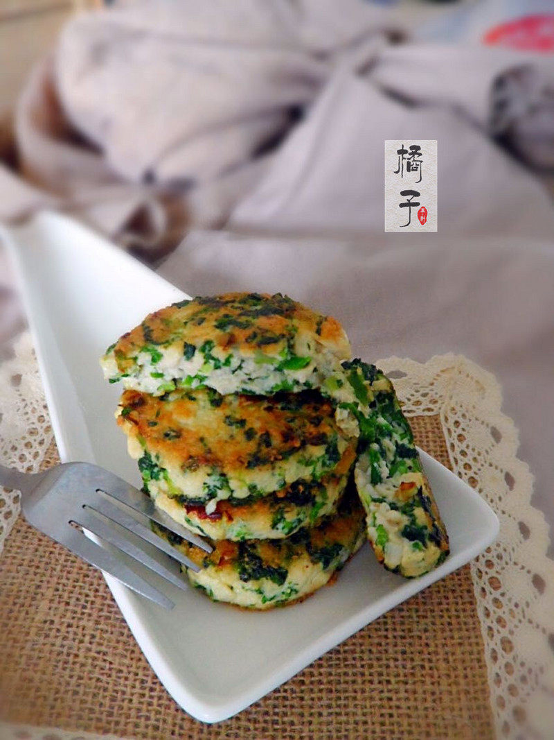 7:平底锅烧热,加入少许植物油,把豆腐荠菜圆饼逐个放入锅中,小火煎制。