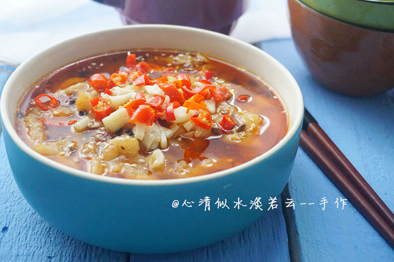 9:汤烧开后下入龙里鱼片煮熟,加适量的盐调味