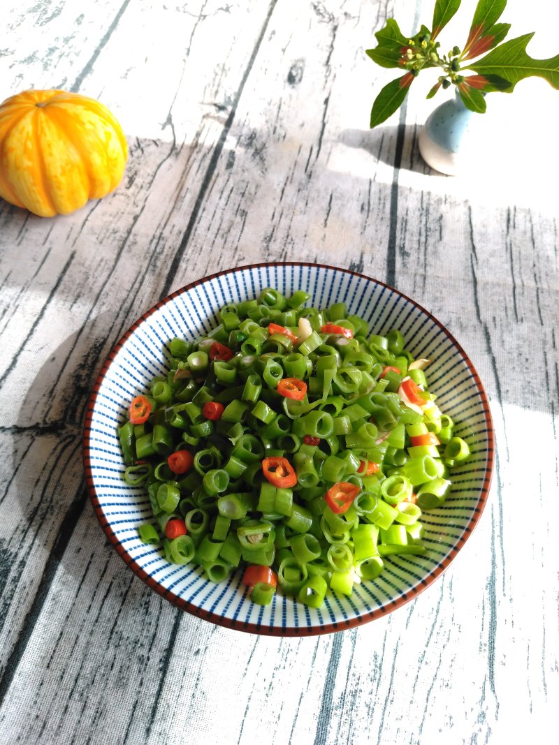 2:空心菜梗切成小段、辣椒斜切、大蒜头切碎。