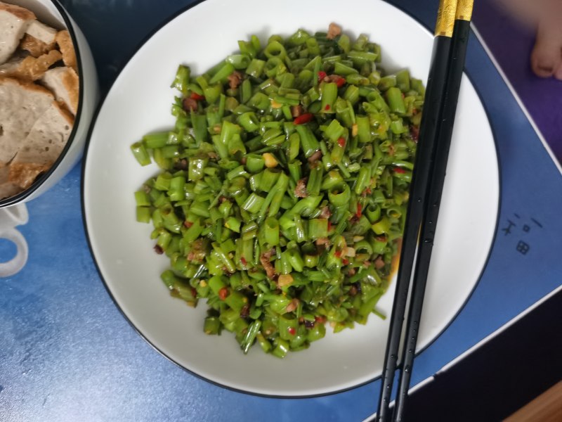 4:热锅烧油放入香肠炒香,放入姜葱蒜末翻炒出香味,放入豆酱翻炒,放入空心菜杆翻炒断生,放入盐、酱油、剁椒、鸡精、继续翻炒几分钟入味,出锅装盘。