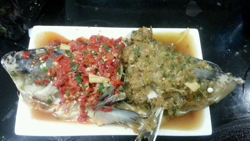7:鱼头放在粉丝上,一边盖上青剁椒,一边盖上红剁椒;