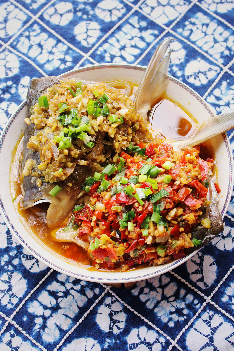 8:蒸锅做水烧开,水开蒸汽上来后再放入鱼头,蒸制10分钟,关火再焖5分钟;