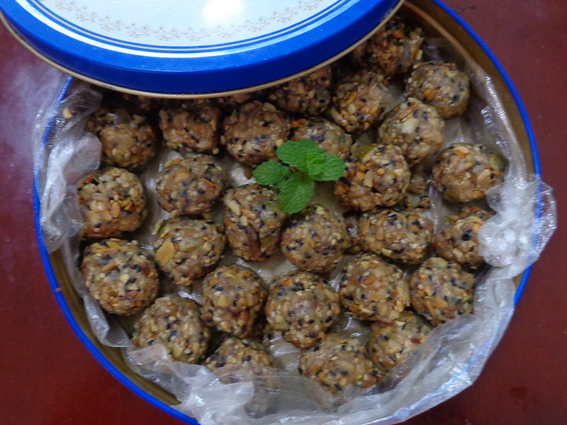 花生适量;核桃适量;杏仁适量;瓜子适量;南瓜子适量;冰糖适量;葡萄干适量;桔子糖适量;糖适量;植物油适量;凉开水适量;糯米粉适量;黑芝麻适量;