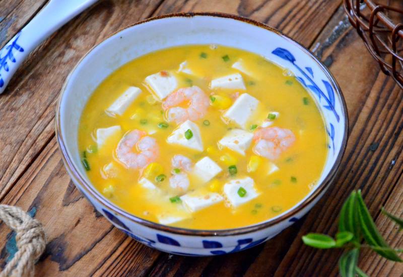 嫩豆腐1盒;虾仁50克;玉米粒20克;