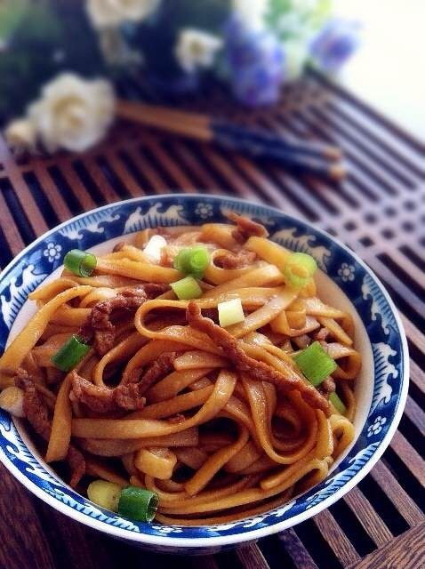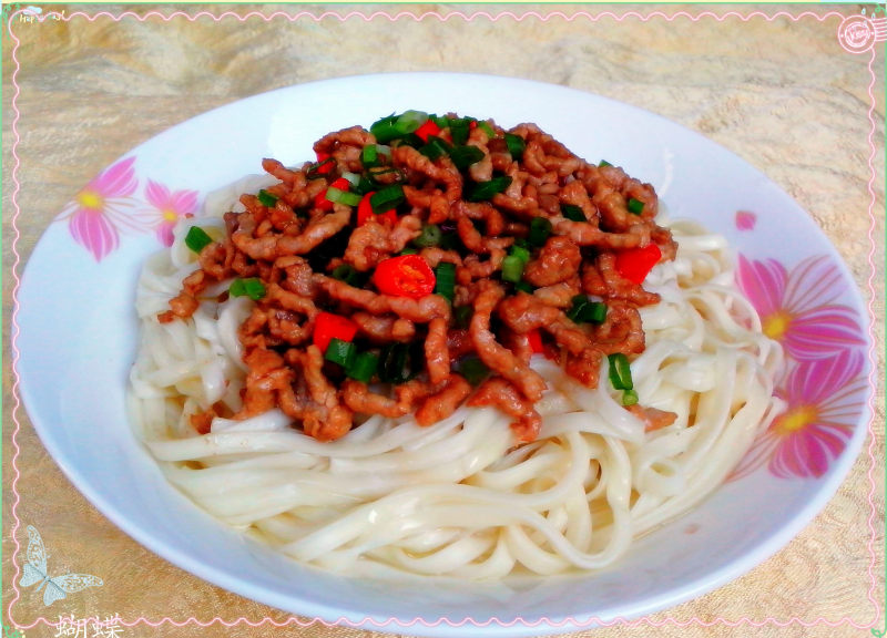 12:煮熟拿出来过一下凉开水,放入肉丝,浇上葱油,撒上葱花就可以吃了