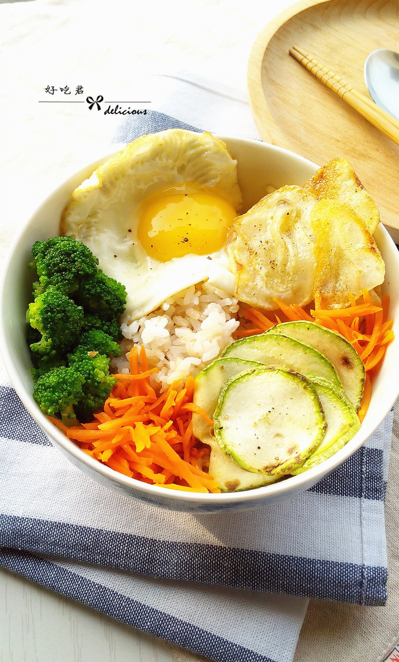 9:炒好的米饭用碗扣压出形状,放上煎好的荷包蛋和青菜,就可以开吃了