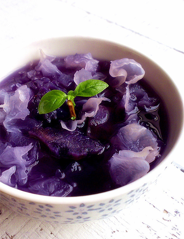 4:银耳泡发,洗好。紫薯切成小块之后混合到一起。全部原料放入煮锅里。加入适量水。水开后,小火煮20分钟以上。