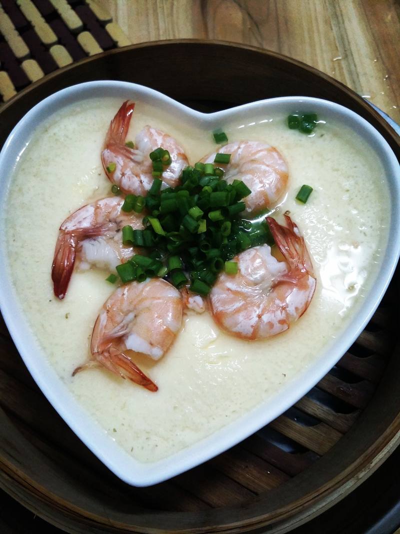 4:水开放入蛋碗!开小火蒸,等蛋有些凝固,放入海虾,猪油,再盖上蒸,蒸熟!