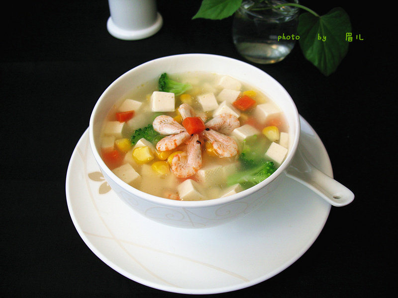 嫩豆腐适量;速冻玉米粒适量;胡萝卜适量;西兰花适量;南极磷虾适量;