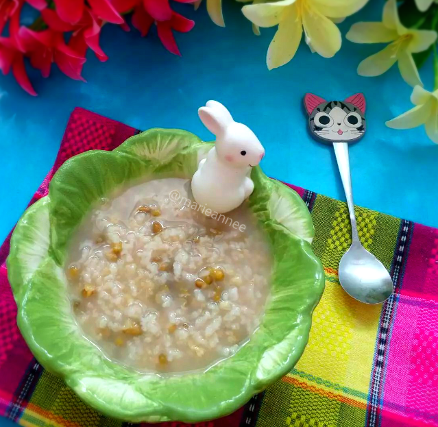 2:淘好的米和煮烂的绿豆放入锅中,找到婴儿粥煮两小时(没有的,可以用煮锅自己煮)。