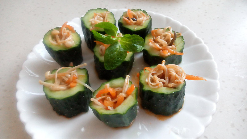 1:把黄瓜切成段,中间掏空,胡萝卜切成细丝,金针菇洗净,
