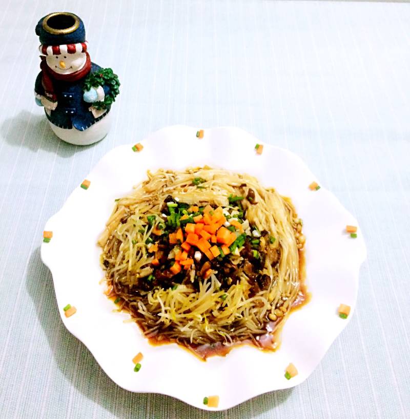 金针菇50g;胡萝卜100g;白砂糖两小勺;油辣椒两小勺;蒜油1/2小勺;