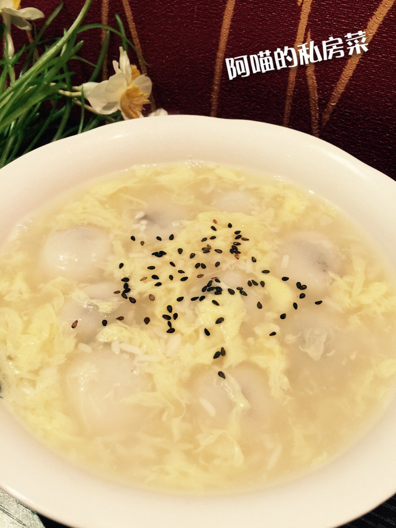 14:等到汤圆煮熟漂起倒入打散的鸡蛋液关火,盛出来上面撒上黑芝麻即可。