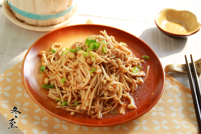 10:金针菇上面撒一层葱花,淋上煮好的酱汁即可。