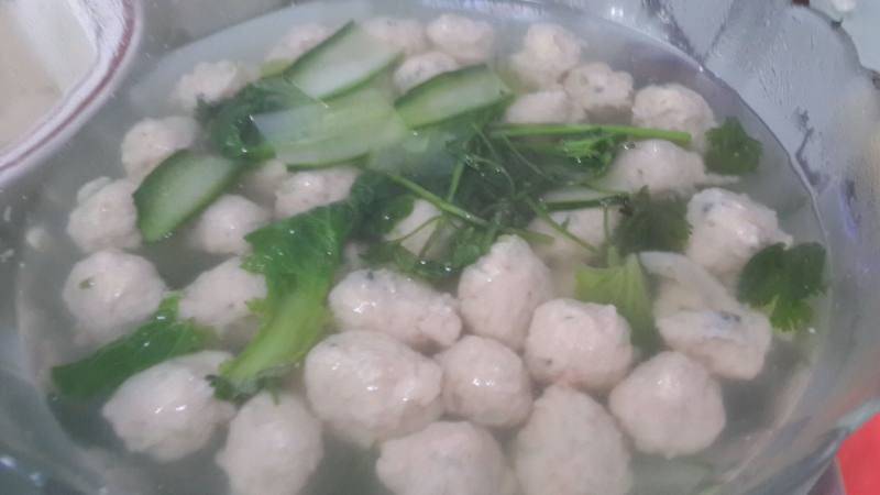 8:水里加入鸡精,烧八成热,汆入虾丸,最后放入菜叶,黄瓜,和香菜,出锅时加入胡椒粉和香油。