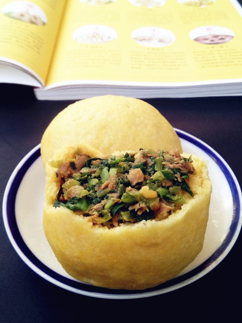 9:用面皮将馅料包裹严,成菜团子坯入蒸锅蒸熟。