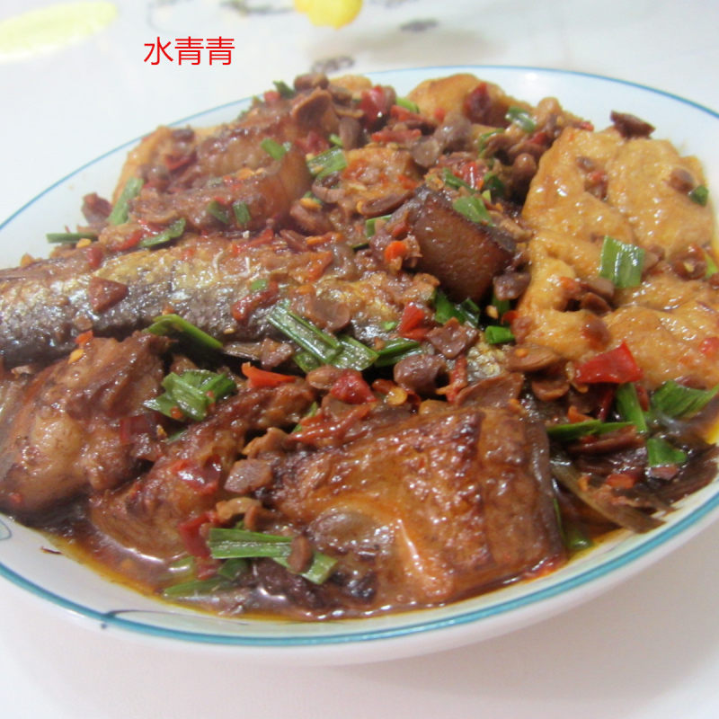 腊鱼适量;烤肉适量;油豆腐适量;咸豆瓣酱适量;