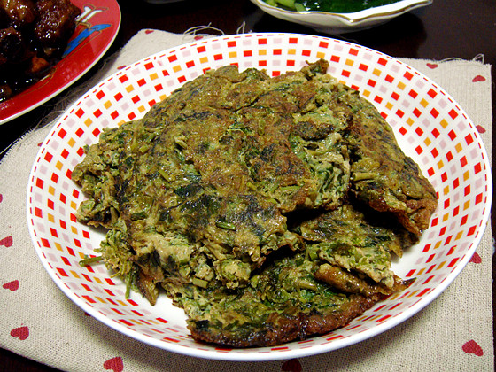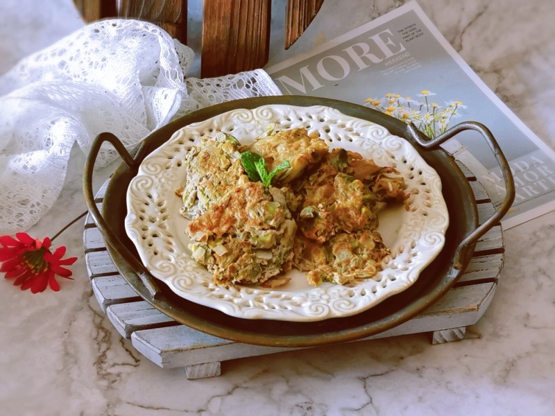 12:烧热后放入香椿蛋液,香椿要尽量均匀的分布在锅里,小火煎熟即可。
