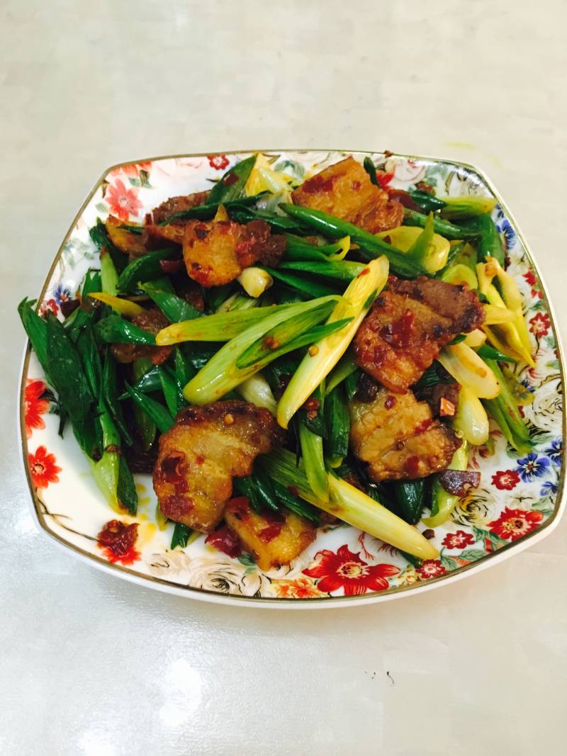五花肉要多煸炒一会儿,一定要煸透。放入青蒜不要炒得太久,否则就不香了。