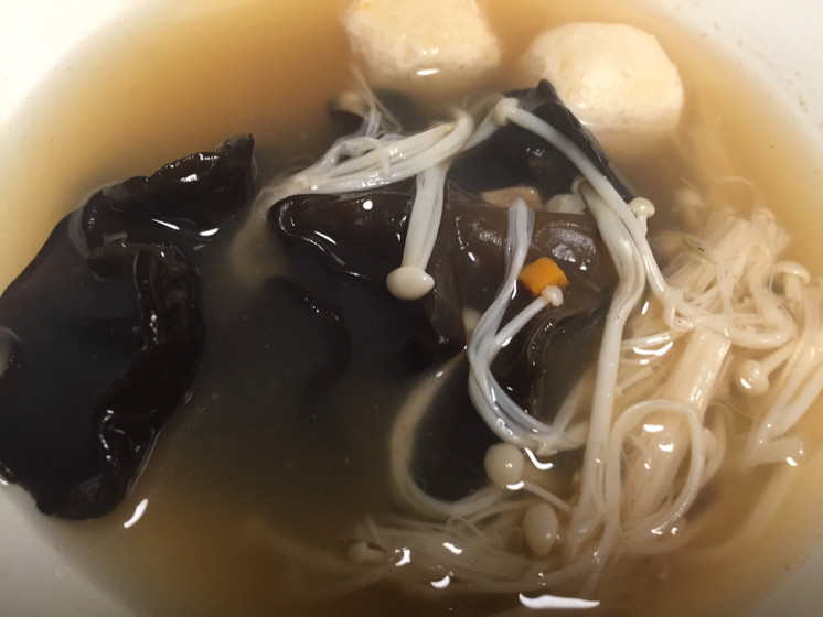 金针菇20克;木耳10克;虾1个;鱼丸2个;