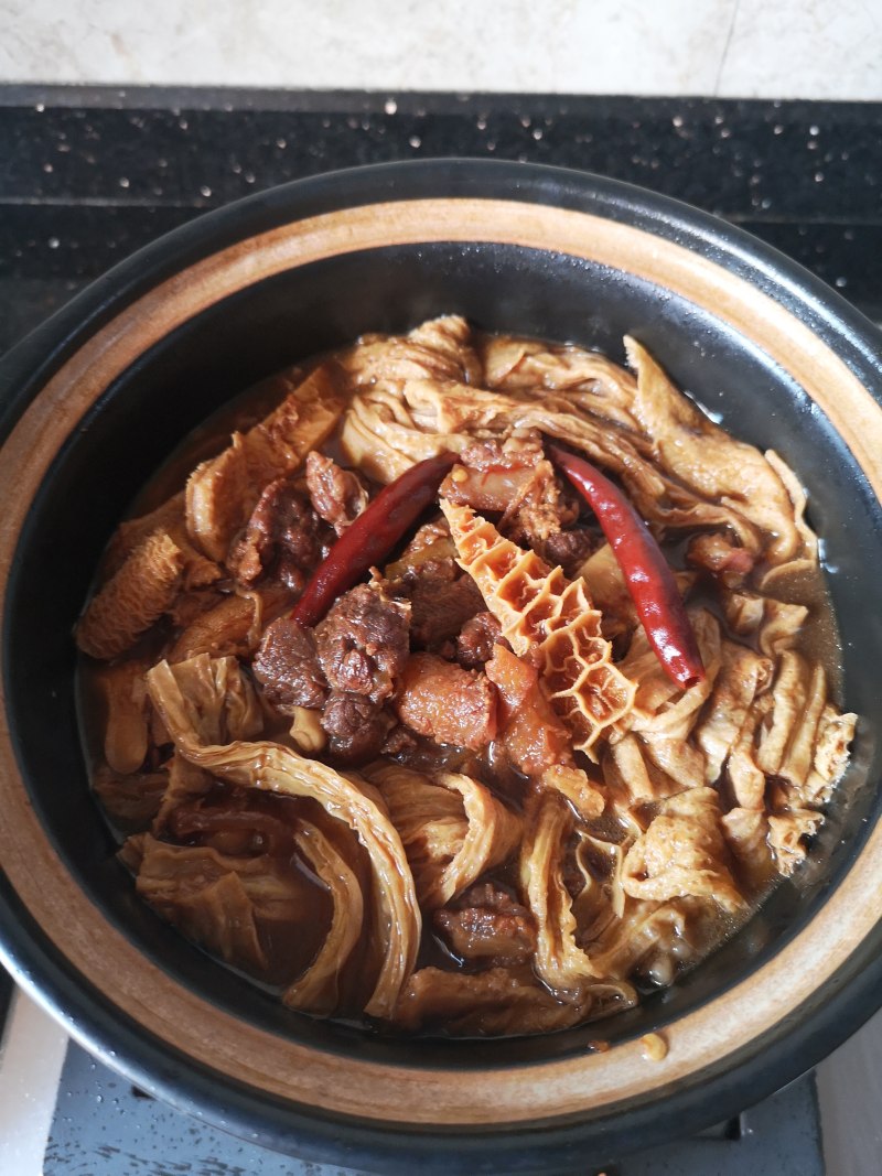 6:支竹洗净擦干水分炸好,放到牛腩里一起炆,选择自己的软硬程度来控制时间。