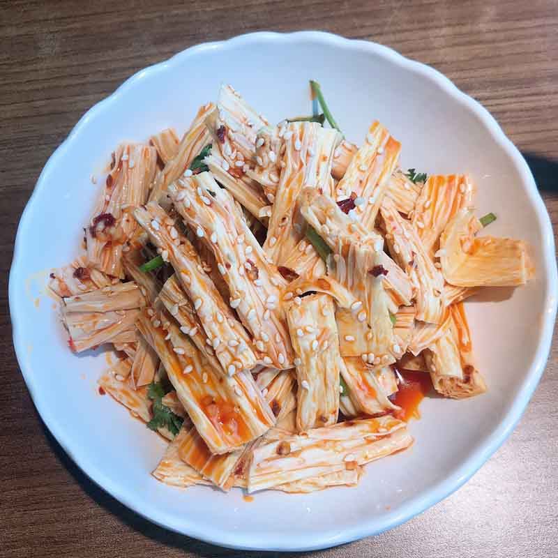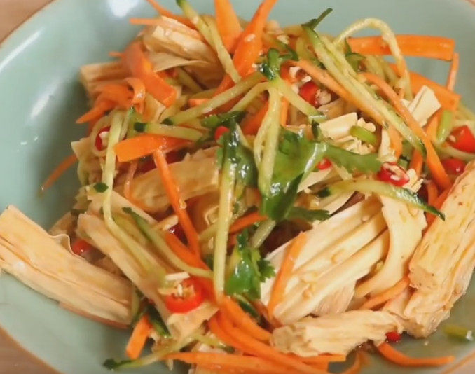 5:支竹沥干水分后放入碗中,加入黄瓜,胡萝卜,蒜末,小米辣,盐,陈醋,生抽,辣椒油,芝麻香油,香菜。