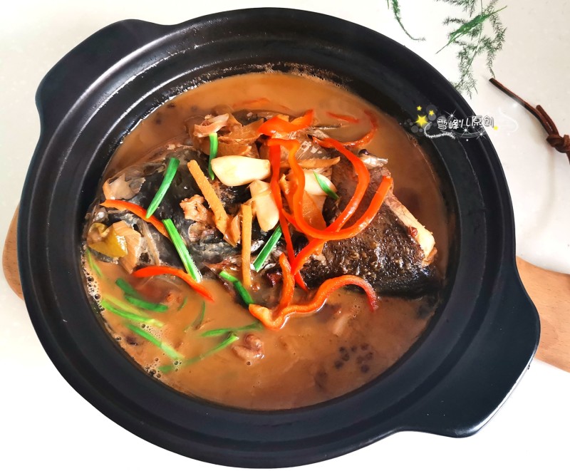 13:再将腐竹和鱼头放入锅内,加盖小火焖煮两分钟即可。