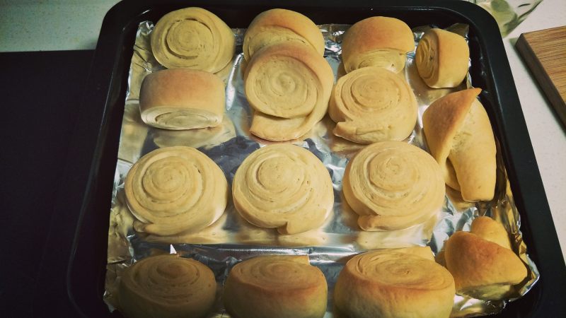 7:在分成9个均匀的面剂子,搓圆,直接放入烤盘二次饧发。