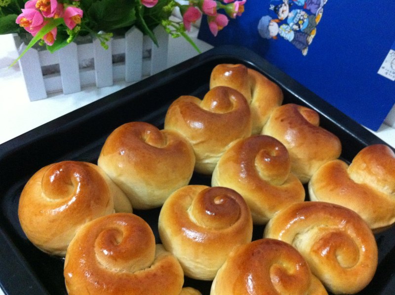 高粉250克;酵母4克;黄油25克;牛奶110ml;鸡蛋1个;