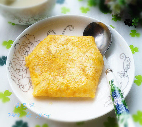 5:蛋液凝固,放适量炒好的米饭。包成五边形。