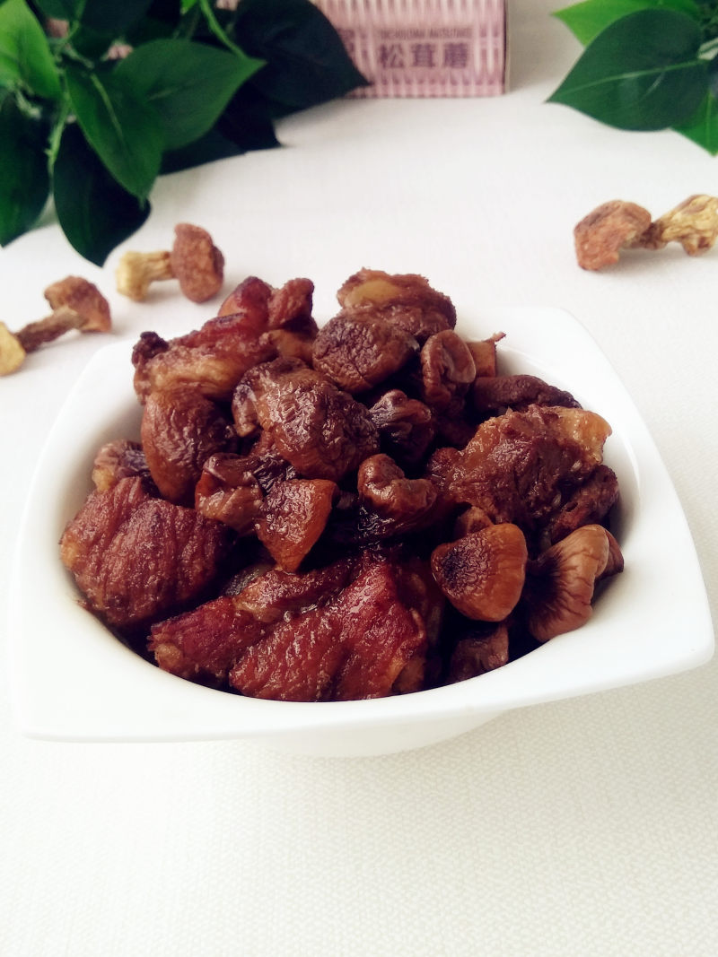 8:倒入浸泡松茸蘑的水,再加适量开水盖上锅盖烧。大火烧开锅,改小火慢烧,其间适时翻炒。