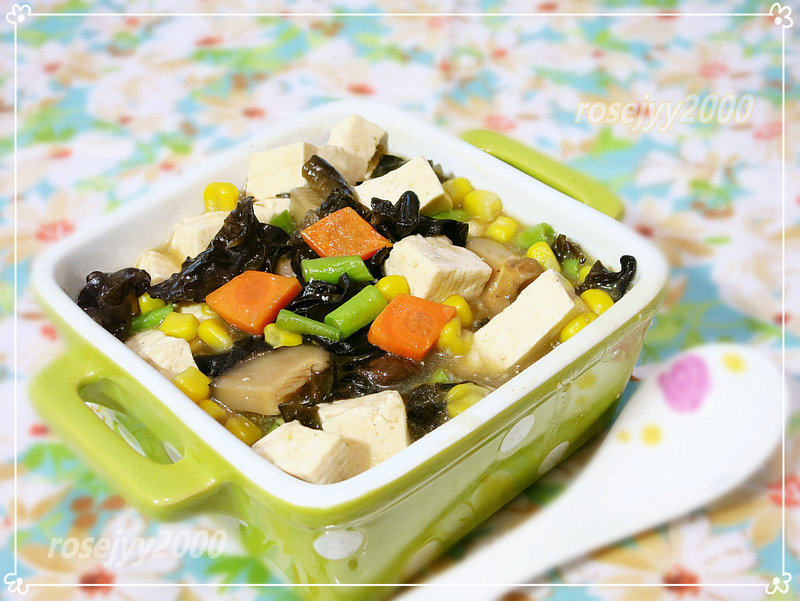 北豆腐450克;水发木耳1/2杯;水发冬菇粒1/2杯;豇豆粒1/2杯;玉米1/2杯;红萝卜约20片;