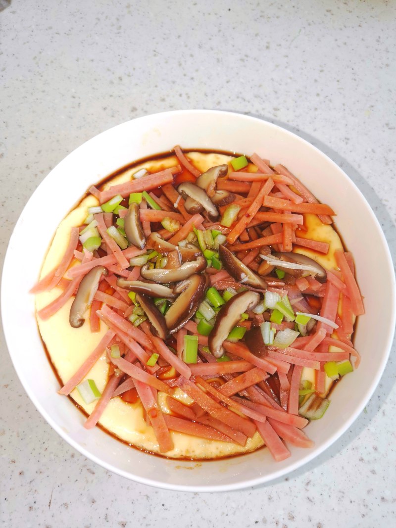 4:蒸好的鸡蛋羹取出,撒上香菇片和香肠丝,淋上生抽和香油,撒葱花即可。