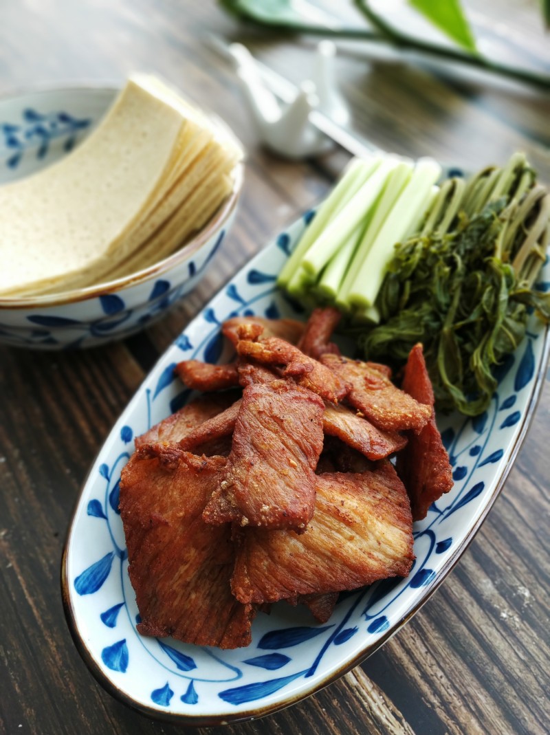 12:用煎饼把肉片、蒜苔和香椿卷起来吃,酥脆喷香,美味好吃!