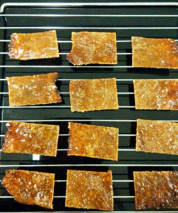1,酱油类的调料不要放太多,烤出来容易发黑。2,压的薄一些,烤出来颜色好。3,烤箱是15L的,这些份量烤了两盘。4,烤箱温度和时间仅供参考,喜欢吃有嚼劲的可以延长烤制时间。5,蜂蜜水就是蜂蜜加少量水稀释。